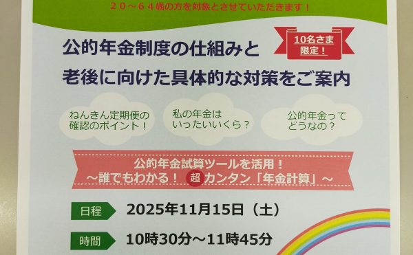 2025年10月10日渡良瀬ホールディング【ねんきん定期便の見方】かんたんセミナー開催決定! 11/15(土)10:30~11:45公的年金の仕組みと、ねんきん定期便の見方をわかりやくご説明します。 対象者は20~64歳の方、10名さま限定!!(参加費無料)となります。 少しでもご興味ある方はお気軽にお問合せ下さい。